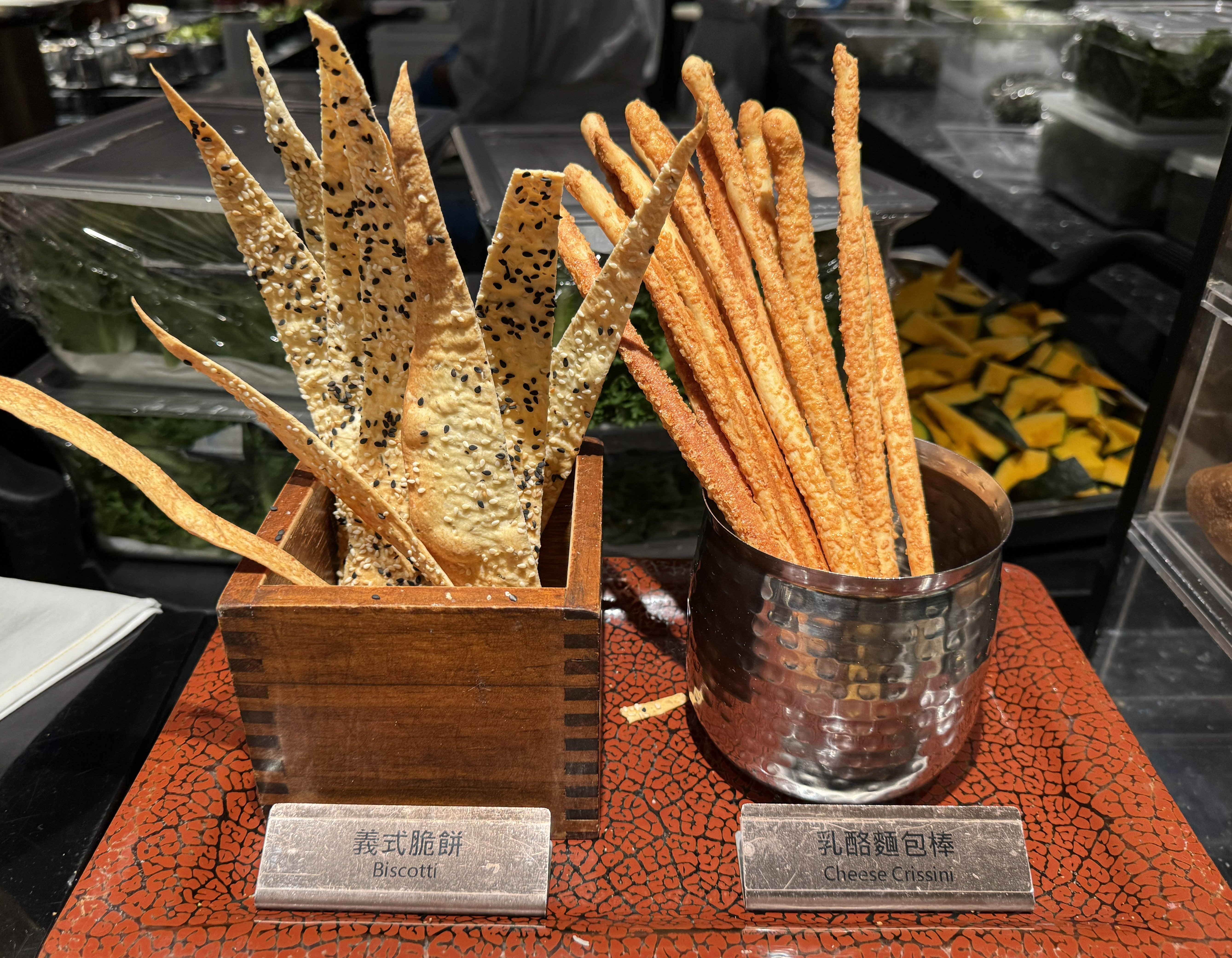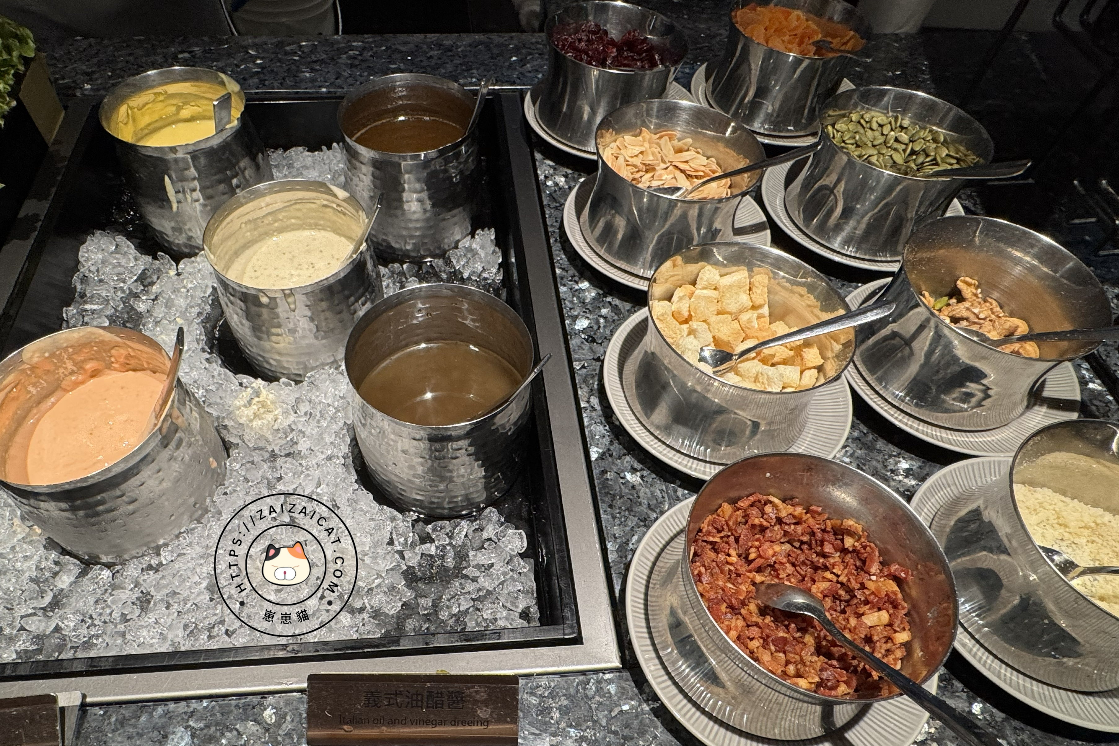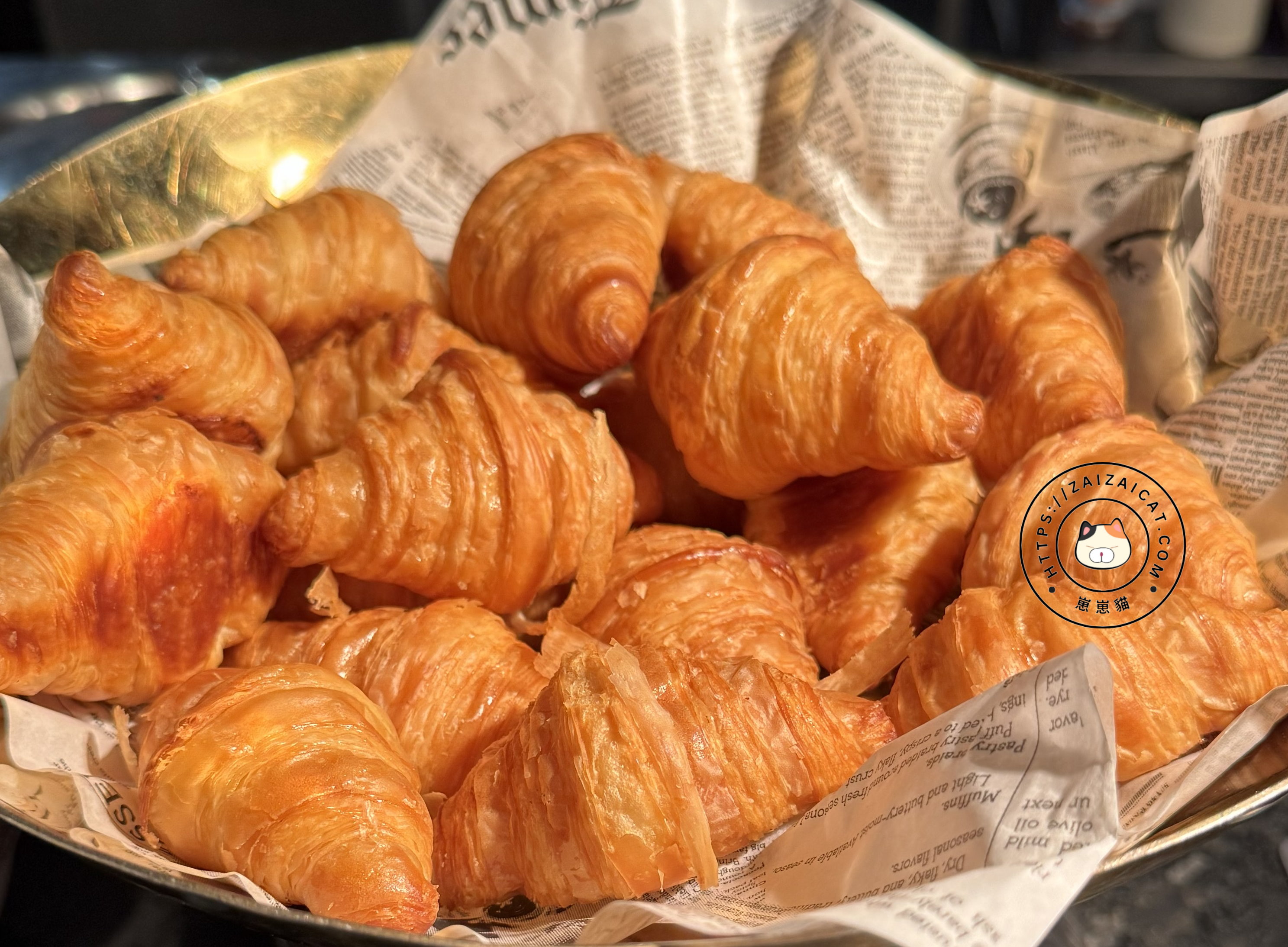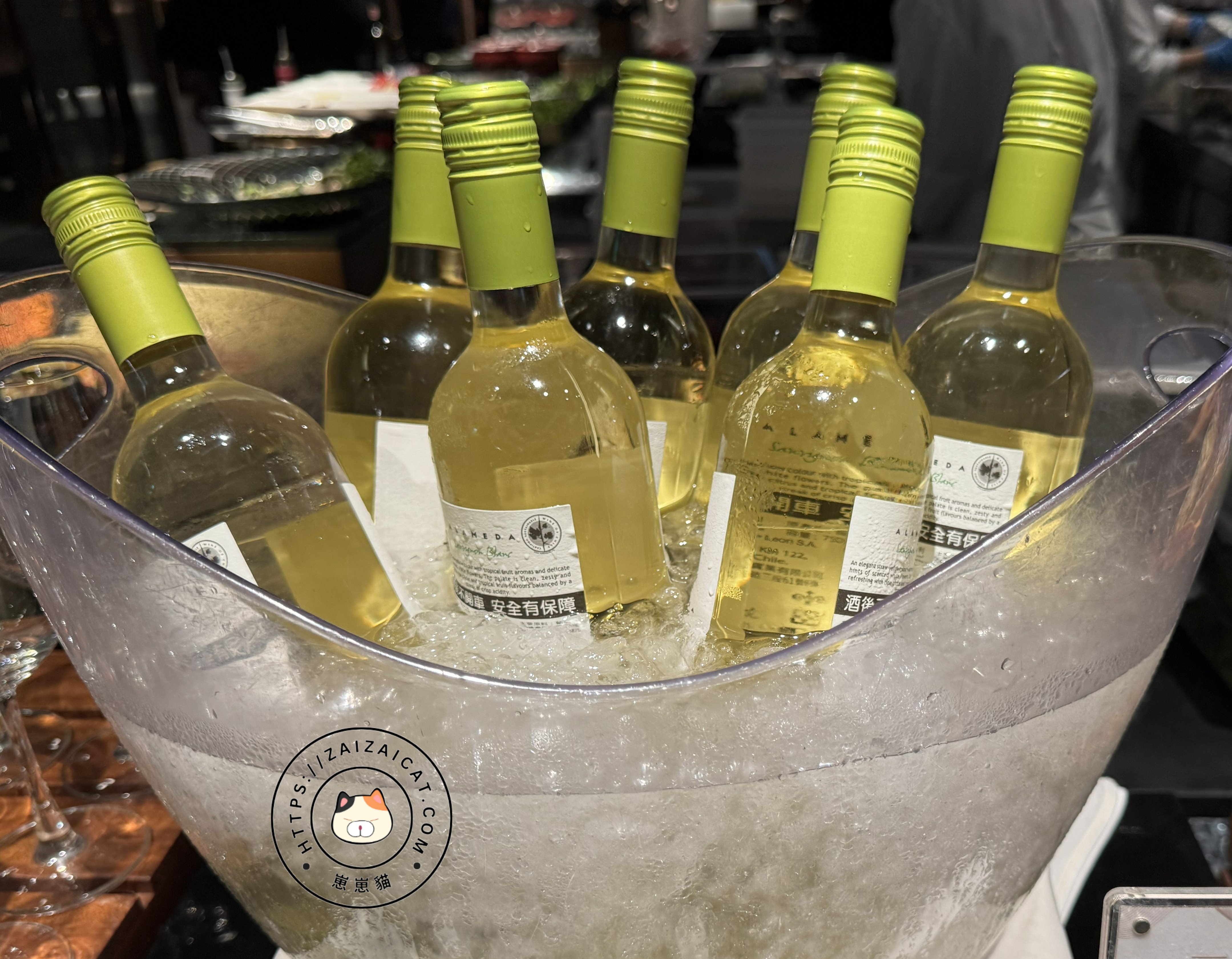 喜歡海鮮的人一定要先衝這區啊~冰檯上滿滿都是新鮮海味 🐚!旁邊的生菜沙拉區也不馬虎 🥗,看起來超翠綠、超新鮮✨,配料跟沙拉醬也很多總類。還有三種肝醬(雖然我不太敢吃🤣),但香氣真的超濃郁。這一區最適合搭配冰冰的白酒 🍷,品牌是ALAMEDA Sauvignon Blanc 白蘇維濃白酒,微酸清爽的口感配上海鮮,超級開胃~🥖 而且一定不能錯過旁邊的麵包區!有各式手作法式麵包、乳酪麵包棒、義式脆餅等等,香氣撲鼻,每一種都想拿來試試。我最喜歡的是那個「包麻糬的麵包」💛,烤過後熱熱的,外酥內軟、還有QQ的嚼感,越吃越香~真的超療癒 😋。