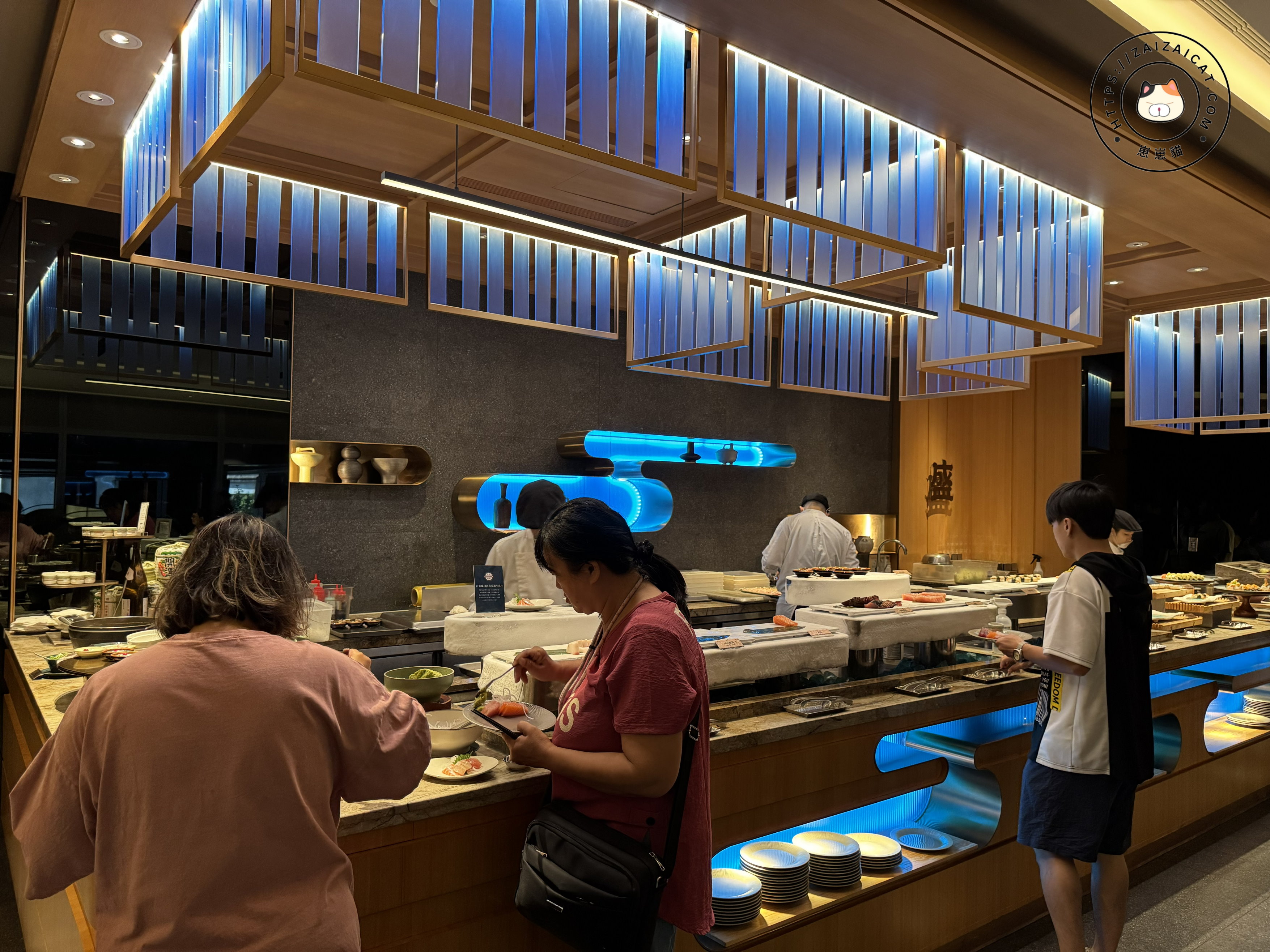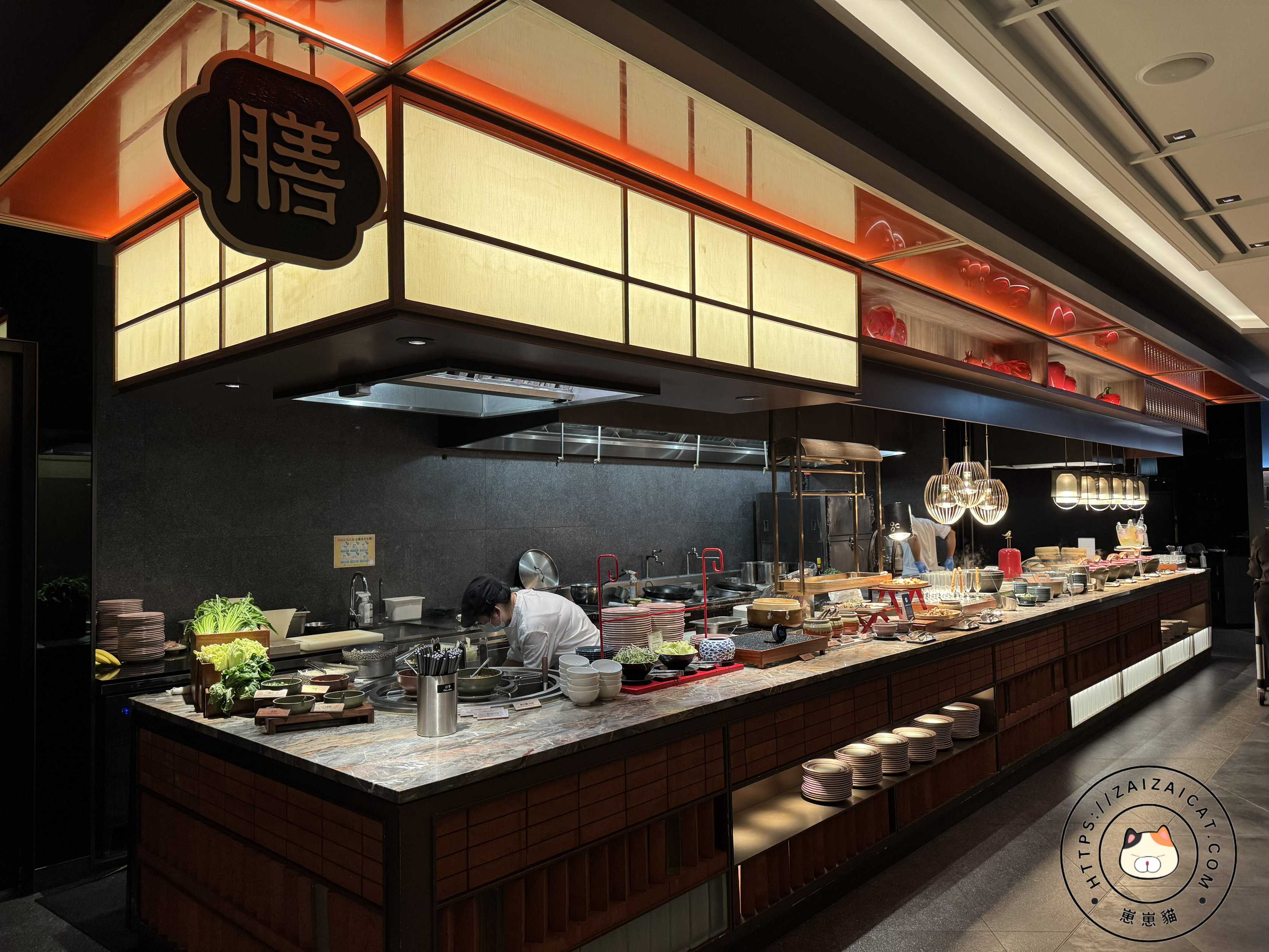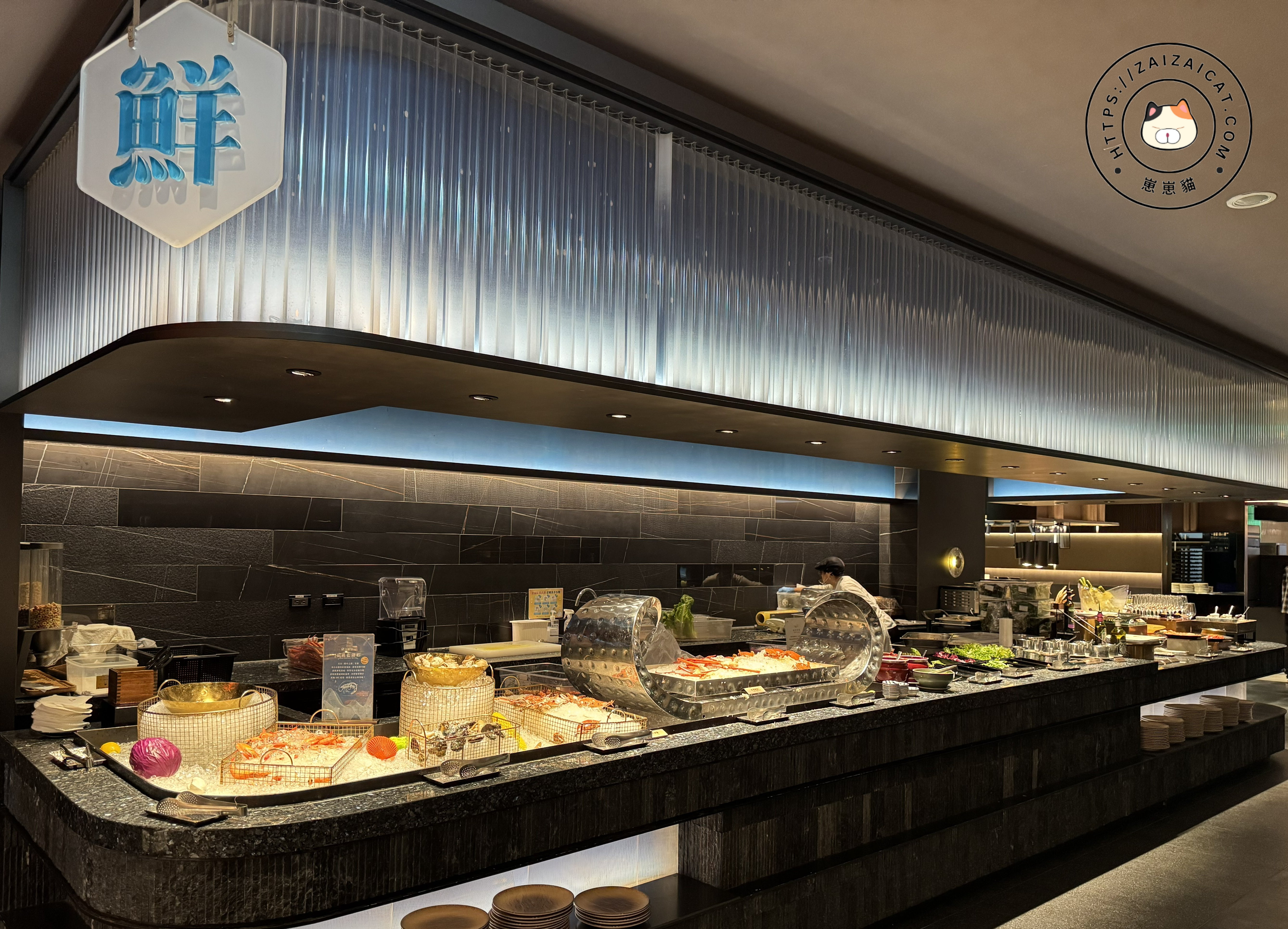 島語自助餐最有特色的地方,就是把取餐區分成八個主題「島檯」🏝️。每一座島檯都像一座小島一樣獨立設計、風格各異,不但好吃也好拍 📸。而且更厲害的是,每一區都有搭配適合的酒款或飲品 🍷,像日料配清酒、海鮮配白酒、烤物配紅酒。島檯的動線是一直線設計,所以取餐動線很順,不太會人擠人 👍。只是我們那天的座位剛好被安排在門口,距離甜點區有一點遠 🍰,每次想吃甜點都得走一小段路(算是吃飯兼運動吧🤣)。