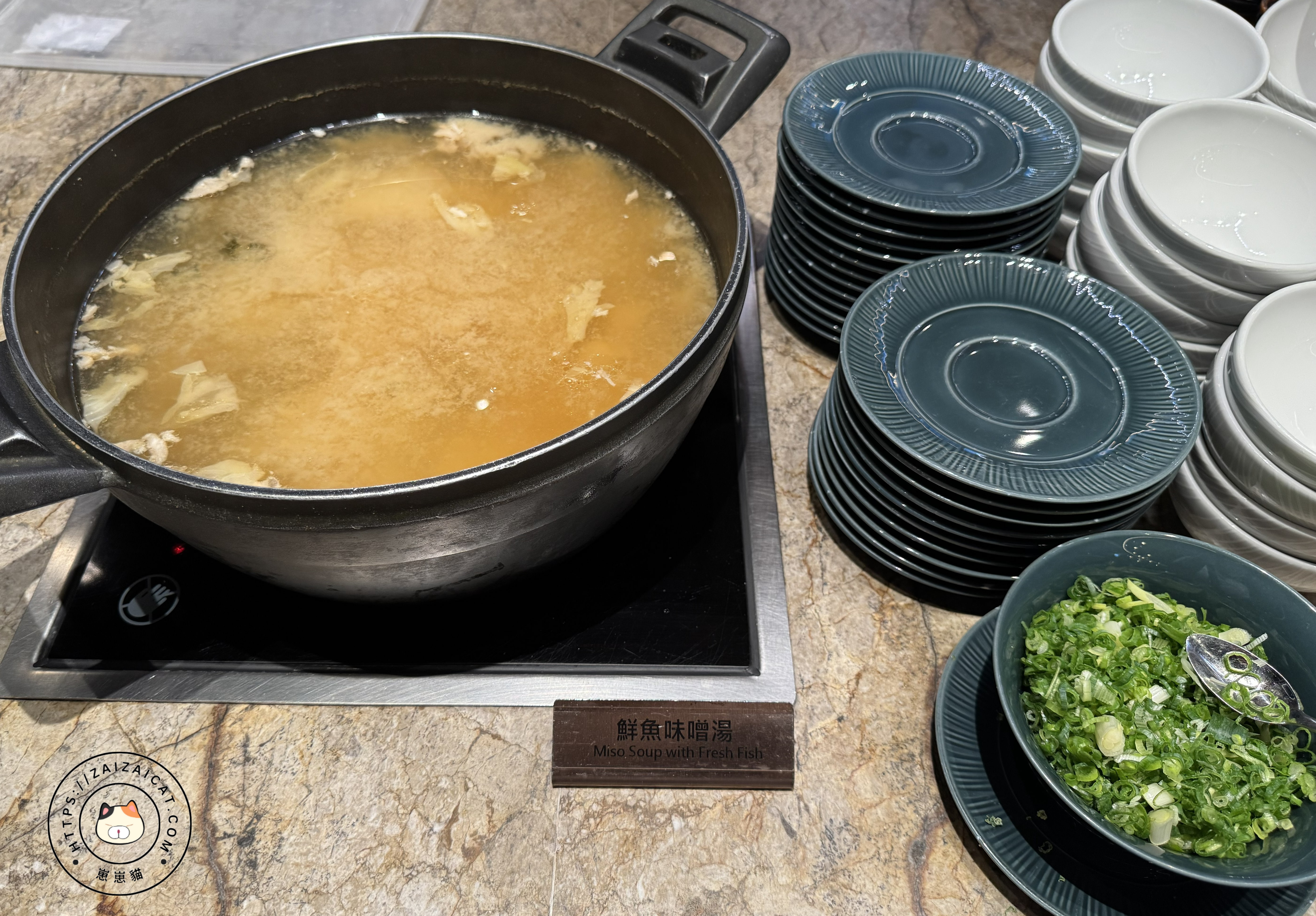 這區主打各式日料與生食🍣,搭配的是清酒,有從台東成功漁港直送的現流魚🐟、旗魚、鰹魚、北海道大干貝等,全都整齊排在冰檯上,看起來超新鮮~✨不過因為我不太吃生食 😅,所以這區我主要是拿壽司🍱,壽司飯用的是高雄147香米,搭配主廚特調的壽司醋,吃起來酸甜平衡、米粒Q彈,口感很棒~👏還有鮭魚味噌湯,湯頭濃郁卻不死鹹,帶著鮮鮭魚的油香和味噌的甘甜,喝起來超順口~